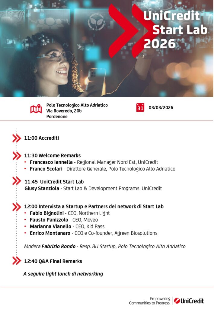 Durante l’evento verranno presentati i contenuti e le opportunità del programma UniCredit Start Lab 2026, che supporta le imprese innovative attraverso mentorship qualificata, connessioni industriali e maggiore credibilità verso investitori e stakeholder.