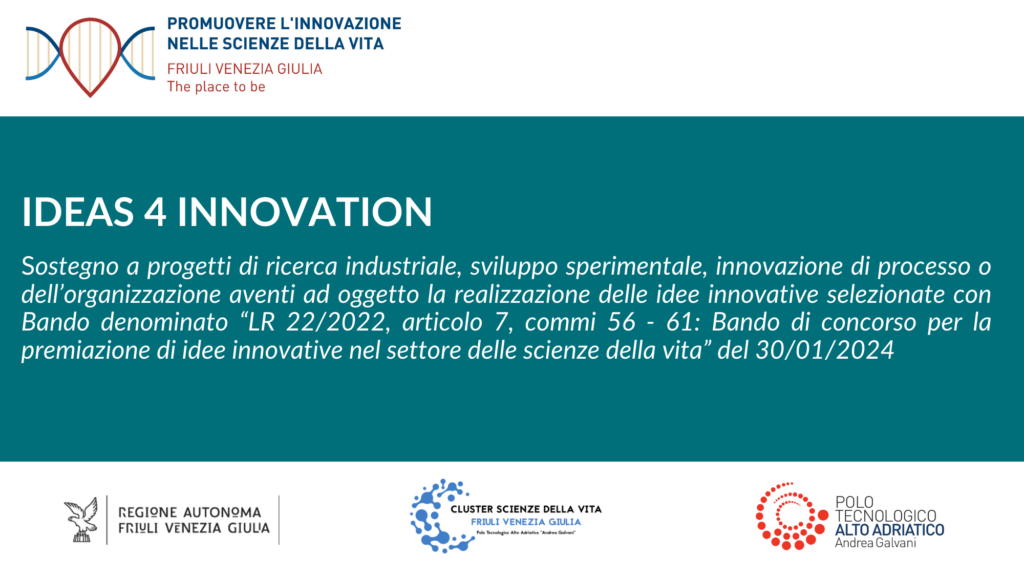 L.R. 22/2022, articolo 7, commi 56 – 61. – Avviso per il sostegno a progetti di ricerca industriale, sviluppo sperimentale, innovazione di processo o dell’organizzazione aventi ad oggetto la realizzazione delle idee innovative selezionate con Bando denominato “LR 22/2022, articolo 7, commi 56 – 61: Bando di concorso per la premiazione di idee innovative nel settore delle scienze della vita” del 30/01/2024 – “Ideas 4 Innovation- I4I
