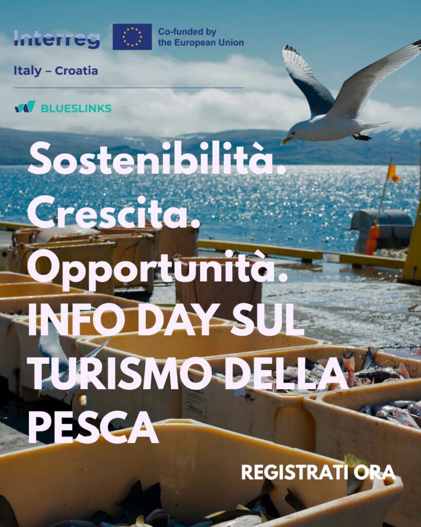 Nell’ambito del progetto BLUESLINKS di cui il Polo Tecnologico Alto Adriatico è partner, Attività 2.3. Info day and exchange of innovative services for fisheries tourism SMEs viene organizzato il I infoday / giornata informativa dedicata al settore del pescaturismo e ittiturismo. A seguire, saranno attivate specifiche attività di consulenza rivolte ai partecipanti .